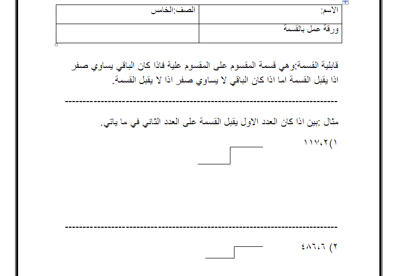ننقل لكم نموذج ورد ورقة عمل قابلية القسمة لمادة الرياضيات للصف