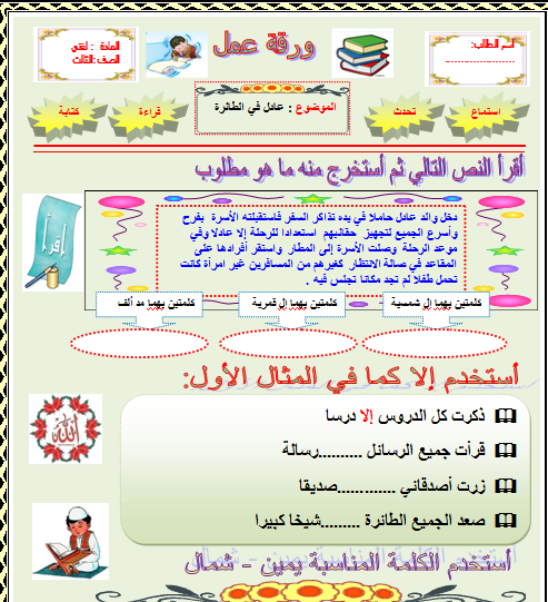 اوراق عمل مادة لغتي الصف الثالث الابتدائي الفصل الاول المنهاج